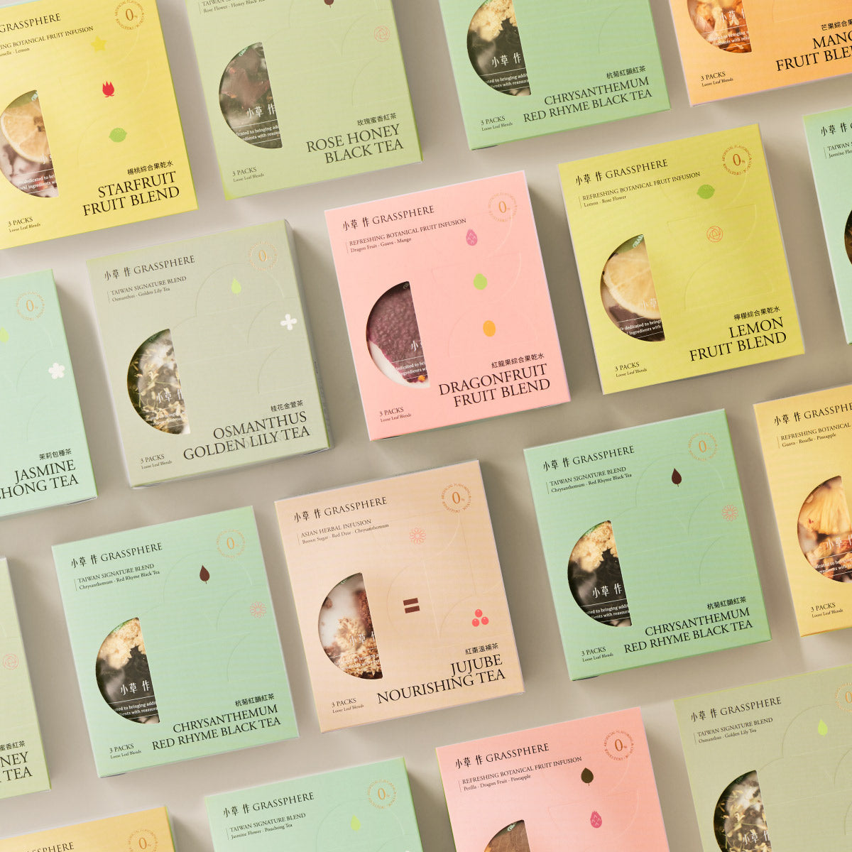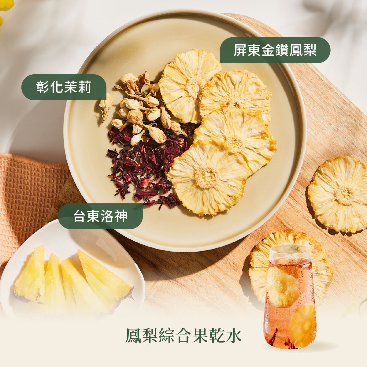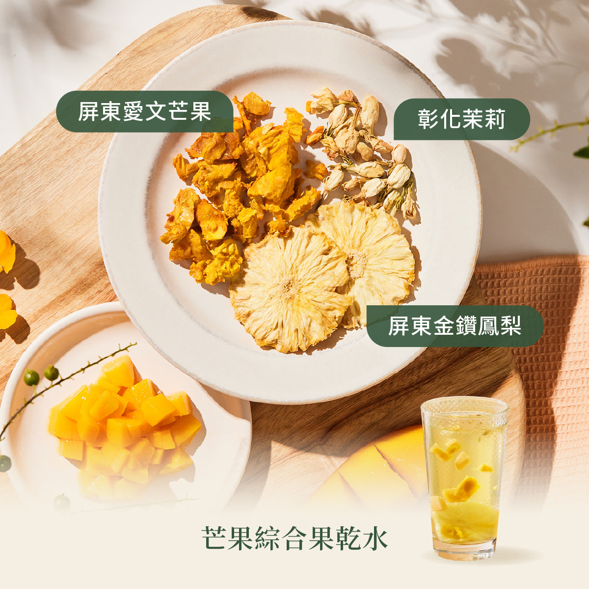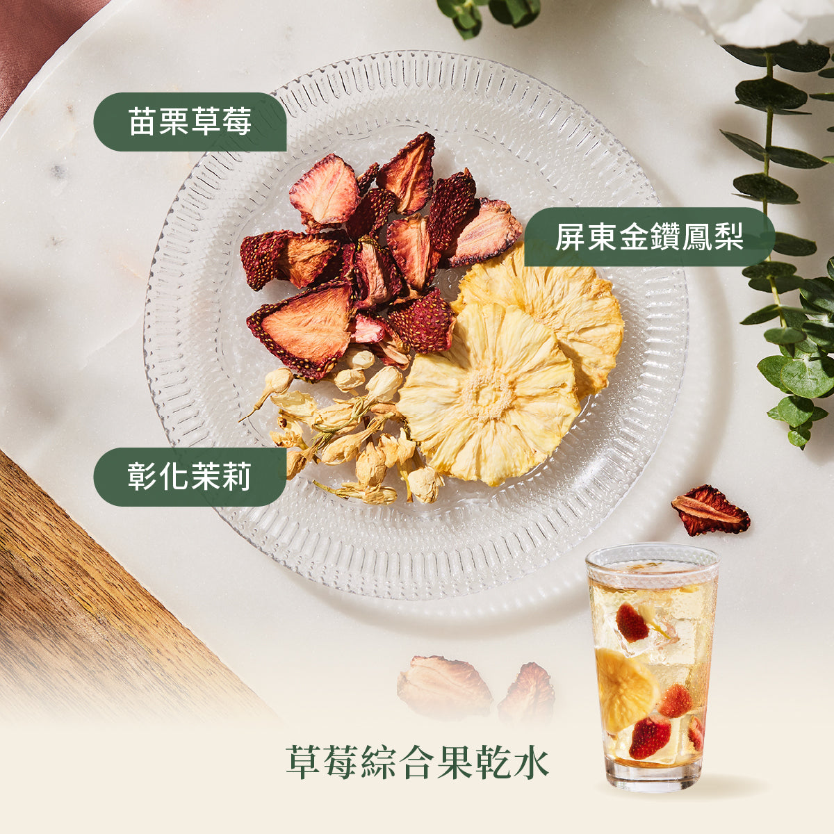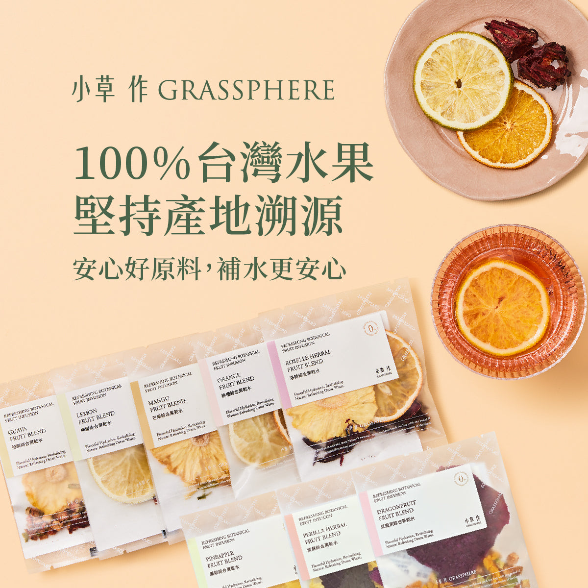 小草作以金鑽鳳梨、愛文芒果、無毒草莓、紅心芭樂、檸檬、柳橙等台灣在地特色水果,搭配香草與花卉,開發具有不同風味層次的果乾水