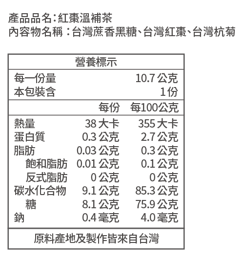 此產品每盒含3包紅棗溫補茶,原料為苗栗有機紅棗、台南關山黑糖、苗栗杭菊。