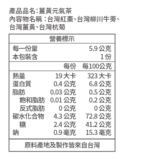 此產品每盒含3包薑黃元氣茶,原料為高雄小林村薑黃、屏東柳川牛蒡、苗栗有機紅棗、苗栗杭菊。