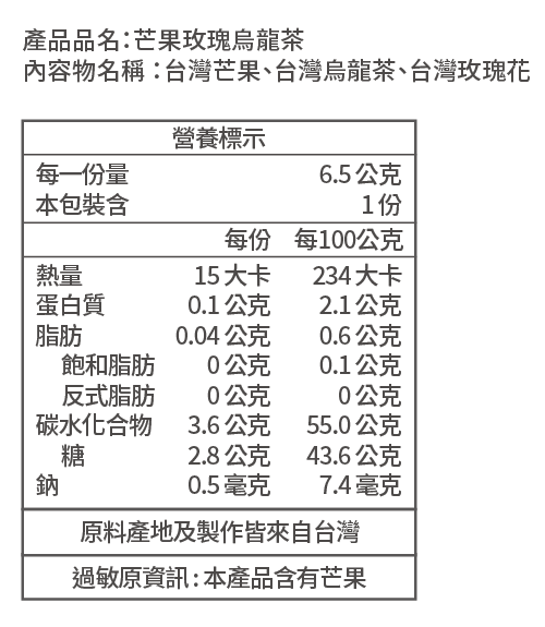本產品每盒含3包芒果玫瑰烏龍茶,原料為屏東愛文芒果、屏東有機玫瑰、宜蘭有機烏龍茶。