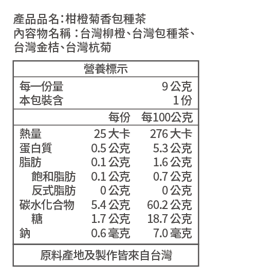 此產品每盒含3包柑橙菊香包種茶,原料為雲林柳橙、屏東金桔、苗栗杭菊、新北坪林包種茶。
