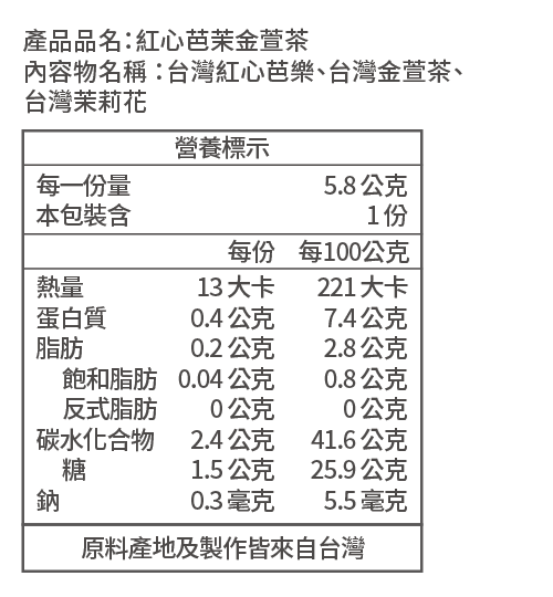 此產品每盒含3包紅心芭茉金萱茶,原料為高雄紅心芭樂、彰化茉莉、宜蘭有機金萱茶。