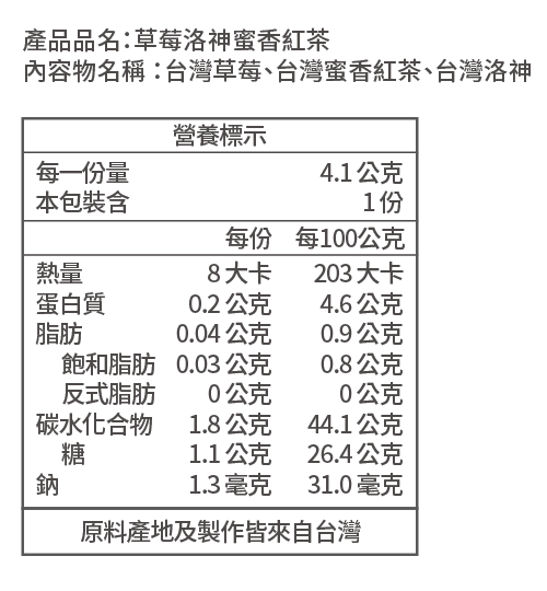 此產品每盒含3包草莓洛神蜜香紅茶,原料為苗栗草莓、台東洛神、宜蘭蜜香紅茶。