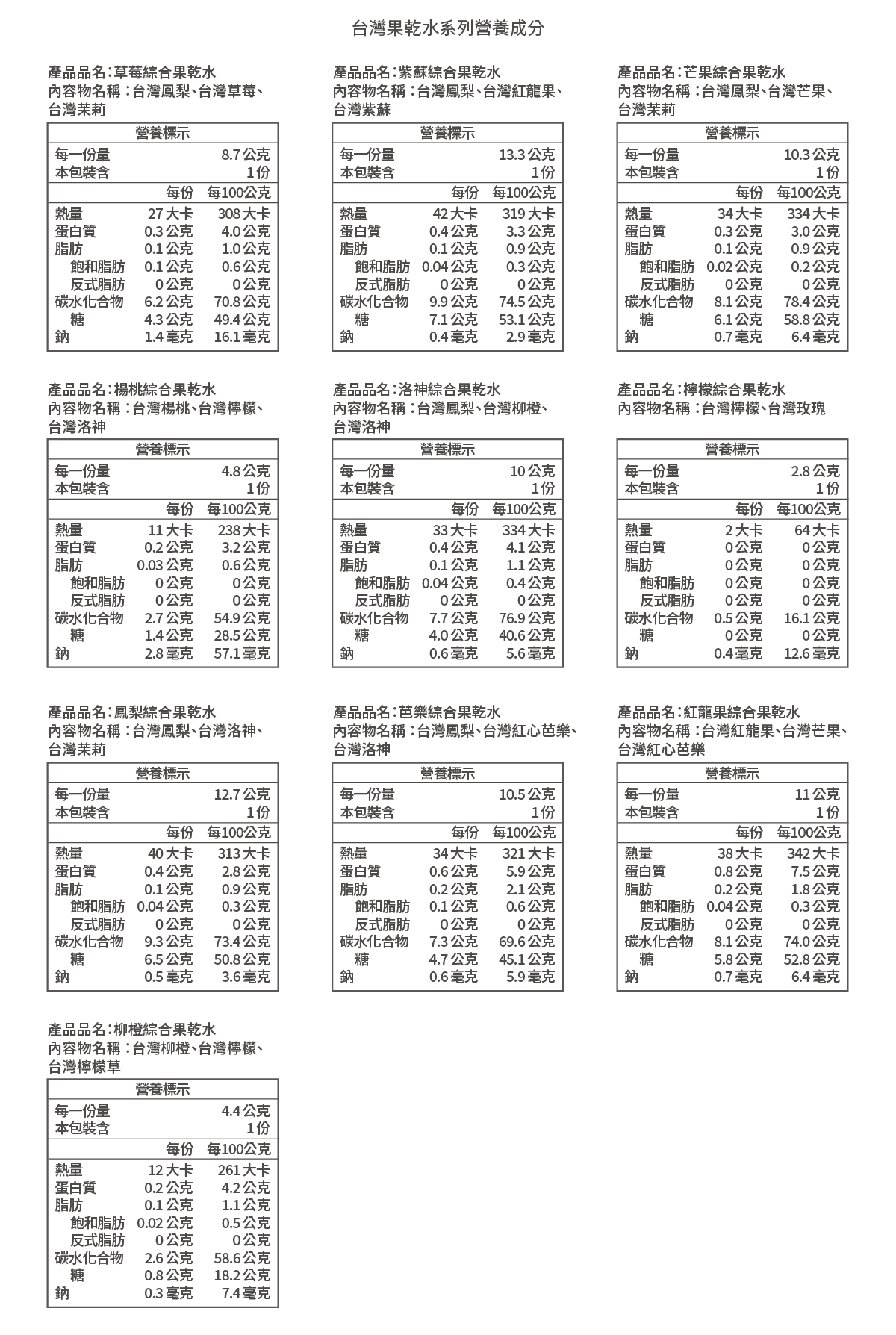 ✓ 果乾水綜合體驗組共10包,每款風味都喝得到:草莓綜合果乾水、紫蘇綜合果乾水、芒果綜合果乾水、楊桃綜合果乾水、洛神綜合果乾水、檸檬綜合果乾水、鳳梨綜合果乾水、芭樂綜合果乾水、紅龍果綜合果乾水、柳橙綜合果乾水各 1 包。