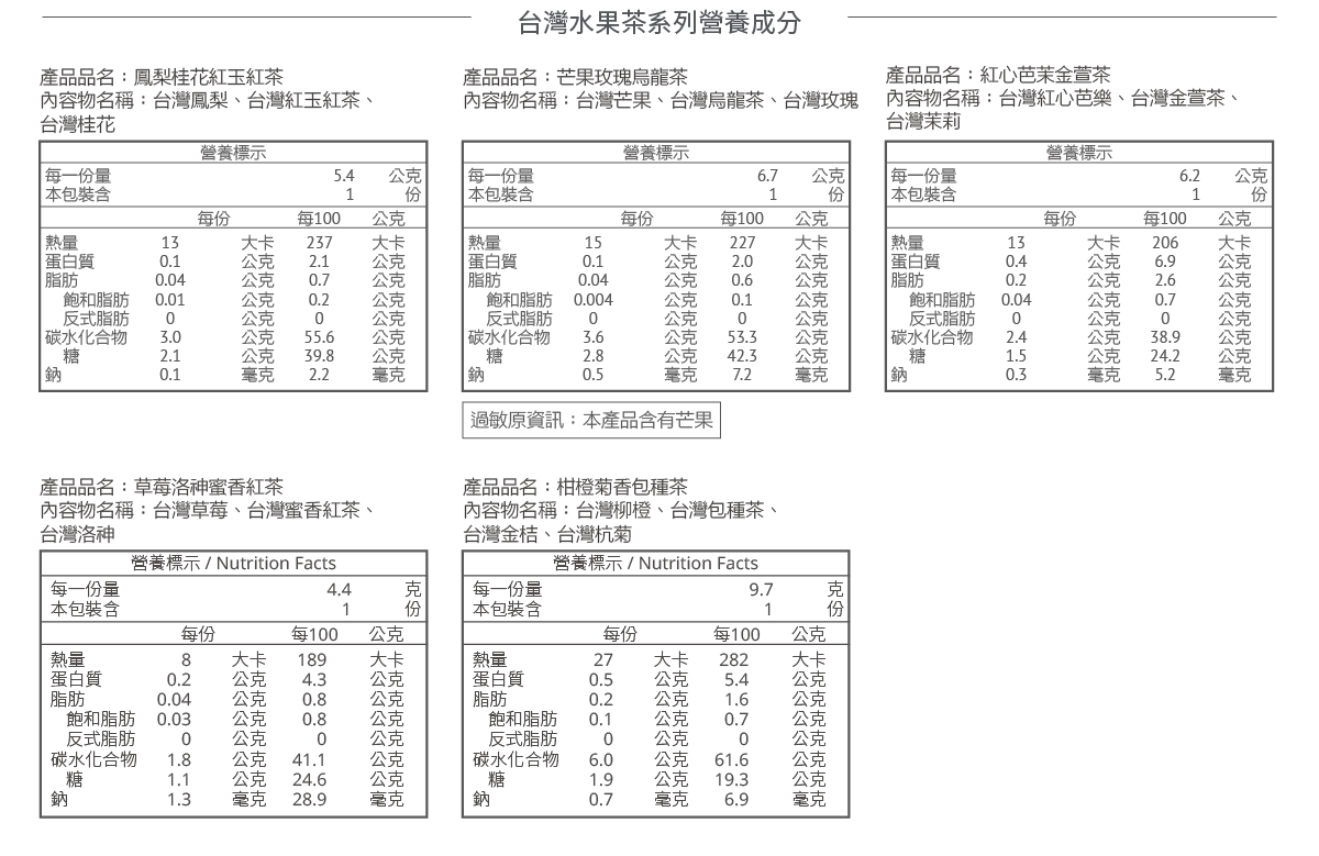 選用 100% 台灣優質水果為基底(包含屏東愛文芒果、屏東金鑽鳳梨、高雄紅心芭樂、苗栗草莓、雲林柳橙),搭配台灣頂級茶葉(宜蘭有機烏龍茶、南投紅玉紅茶、宜蘭有機金萱茶、宜蘭蜜香紅茶、坪林包種茶),輔以可食用花卉,讓台灣茶可以喝出全新的果韻花香。