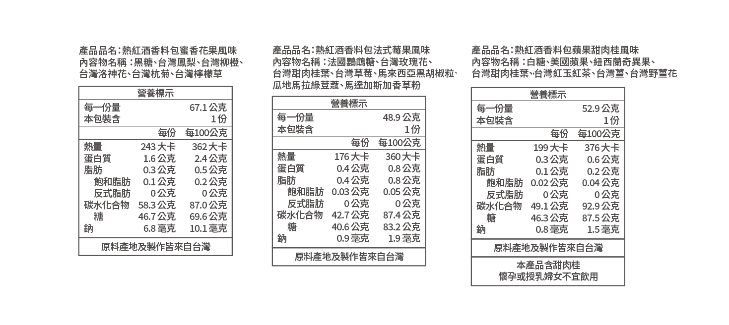 包含 3 款風味各 1 包:蜜香花果風味、蘋果甜肉桂風味、法式莓果風味。
