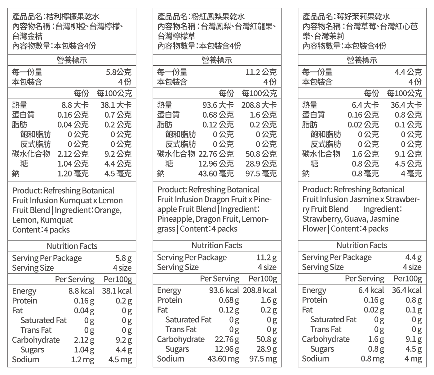 好孕媽咪果乾水一盒共 12 包,每款風味各 4 包,包含:莓好茉莉果乾水(苗栗草莓 x 彰化茉莉花 x 高雄紅心芭樂)、桔利檸檬果乾水(雲林柳橙 x 南投檸檬 x 屏東金桔)、粉紅鳳梨果乾水(屏東鳳梨 x 屏東紅龍果 x 屏東檸檬草)