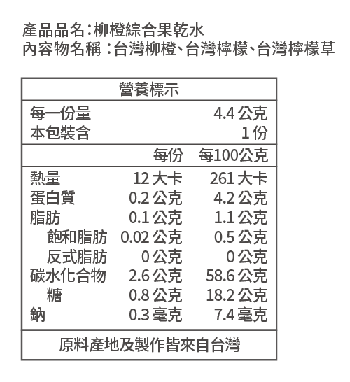 本產品每盒含3包柳橙綜合果乾水,原料為雲林柳橙、苗栗檸檬草、南投檸檬。