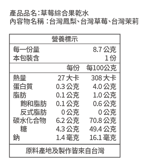 本產品每盒含3包草莓綜合果乾水,原料為苗栗草莓、屏東金鑽鳳梨、彰化茉莉。
